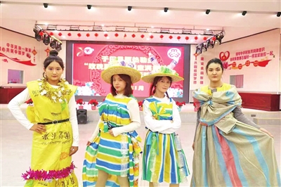 “这件上衣是用爸爸种地剩下的肥料袋做的,我和妈妈一起洗干净、裁剪平整,再用彩笔涂鸦,裙摆是用彩色垃圾袋一层层粘起来的,还加了我们家种的红枣,特别好看!”学生艾吉汗·买赛迪边展示自己的作品,边兴奋地介绍。为了完成这件服装,她和家人一起收集材料、构思设计,不仅体会到了动手的乐趣,更明白了废旧物品也能“变废为宝”。