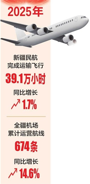 新疆日报乌鲁木齐2月2日讯 石榴云/新疆日报记者马伊宁从2026年新疆民航工作会议暨安全工作会议上获悉:2025年,新疆民航完成运输飞行39.1万小时,同比增长1.7%。全疆机场累计运营航线674条,同比增长14.6%。