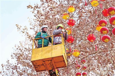 市园林绿化服务中心工作人员刘晋利说:“这几天,我们正忙着在街头悬挂红灯笼和彩灯。目前,乌鲁木齐北路、团结广场路、昆仑路段的彩灯已经悬挂完毕。”