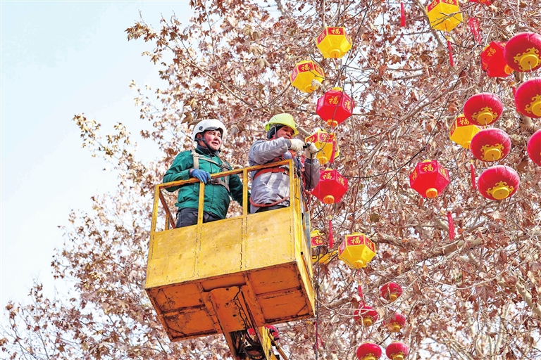 2月2日,在北京西路,和田市市政养护队与市园林绿化服务中心工作人员正分工协作,悬挂红灯笼、铺设彩色灯带。一串串象征吉祥喜庆的红灯笼迎风摇曳,一条条璀璨夺目的彩灯带流光溢彩,让浓厚的节日氛围提前“上线”。