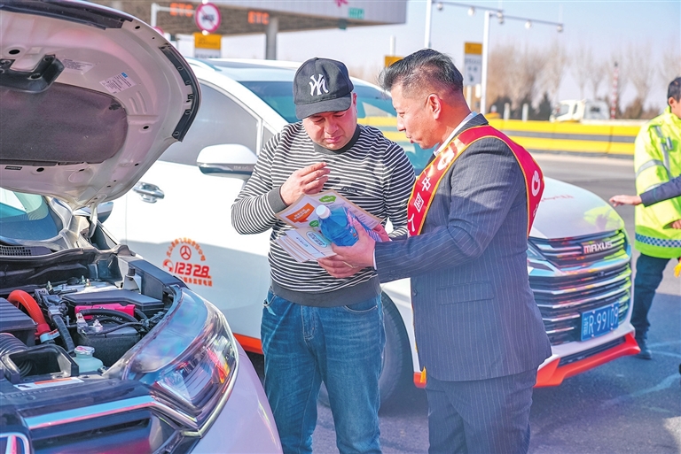 活动现场,“公益护航站点”热闹有序,工作人员为过往群众提供道路救援、故障维修、路线指引、加注玻璃水等贴心服务,还向大家赠送“新春温暖包”,包里有玻璃水、饮用水、方便食品等物资,切实解决了群众出行中的实际需求。同时,志愿者通过发放宣传单、现场讲解等方式,普及道路交通安全知识与金融保险知识,提醒大家防范非法金融活动、提高防灾减灾意识,让安全理念深入人心。