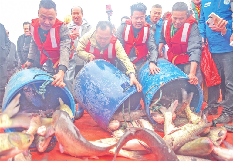 2月7日,在湖南省永州市道县白马渡镇青口村,村民在收获年鱼。新华社发 蒋克青摄
