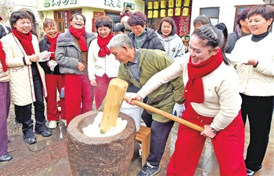 2月6日,浙江省台州市仙居县埠头镇西亚村古村落,游客体验捣麻糍。新华社发 王华斌摄