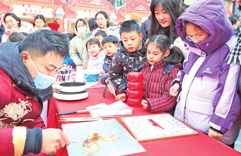 2月7日,小朋友在江苏南京举行的“乐购新春 苏品苏货”年货大集上观看糖画。新华社发 苏阳摄