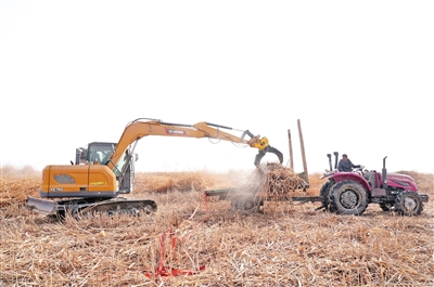 地区融媒讯  (记者  阿卜力克木)2月4日,在塔克拉玛干沙漠南缘的于田县斯也克乡恰瓦村芦苇区,一派繁忙景象呈现眼前。各类机械设备和车辆穿梭于金色苇荡间,有序进行芦苇割取、捆扎和搬运作业。这些干枯芦苇被整齐打包后,将由合作企业统一收购,作为防沙治沙物资运往治沙一线。