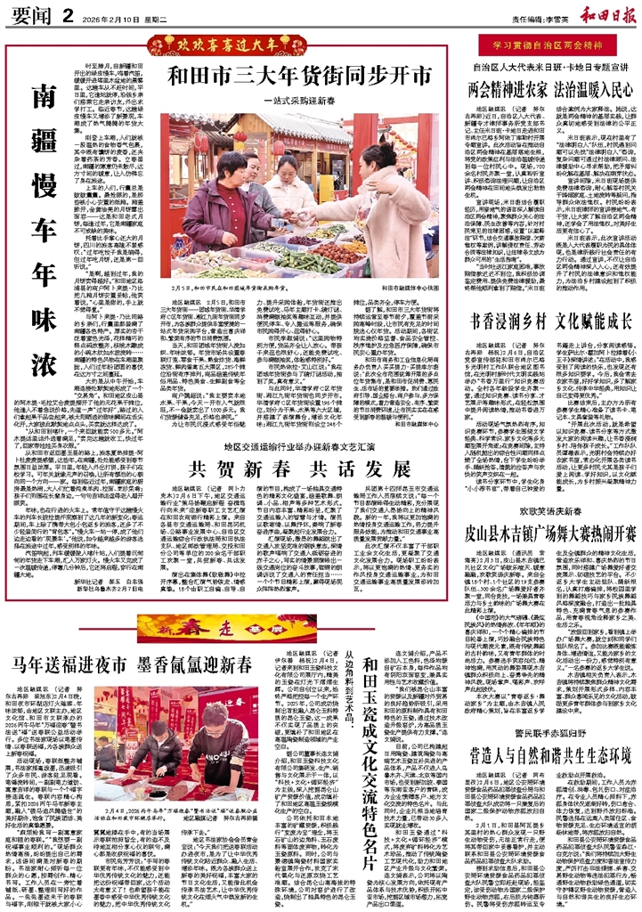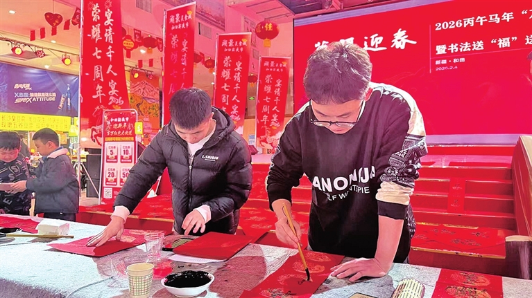 地区融媒讯 (记者 努尔古再丽 柴旭东)2月4日晚,和田夜市环湖店灯火璀璨、年味浓郁,由地区文联主办,地区文化馆、和田市文联承办的2026丙午马年“万福迎春”暨书法送“福”送春联公益活动举行。多位书法家现场以笔墨传情、以春联送福,为各族群众送上新春祝福。