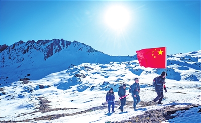 冬日时节,西藏山南市隆子县玉麦乡的群山覆盖着积雪。4名护边员晨光中行进在雪山间,50岁的普布罗布肩扛国旗,走在队伍最前面,索朗多吉、拉巴次仁、洛桑罗布紧跟其后。