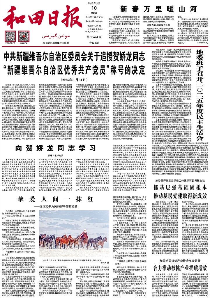 - 合力推动核桃产业提质增效 地区融媒讯 (记者 胡礼政 阿卜力克木)2月8日,和田地区核桃产业协会年会召开,总结2025年产业发展与协会工作,安排部署2026年重点任务,凝聚各方合力推动核桃产业提质增效、转型升级。