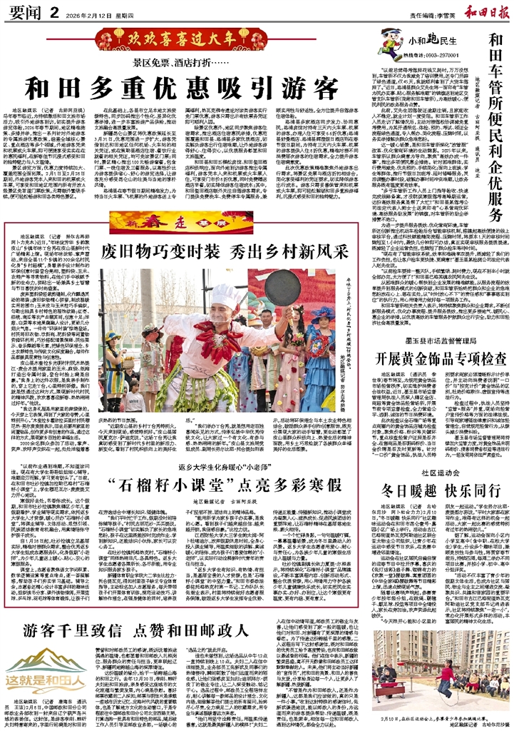 - 和田多重优惠吸引游客 地区融媒讯 (记者 古丽阿亚提)马年春节临近,为持续激活和田文旅市场活力,吸引外地游客到访,切实提升游客游览体验,2026年春节期间,地区精准施策、多措并举,推出一系列针对外地游客的专属旅游优