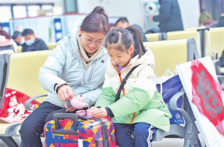 2月2日,在山东省青州市火车站,旅客在候车间隙喝茶。