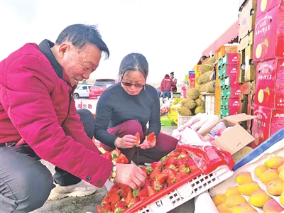 随着市民增多,市场内人流渐密。市民刘怀国的购物车里,装着橙子、草莓、火龙果、石榴、苹果、香梨等七八样水果。“过年家里客人多,每样都备一点。”他说,“价格合适,想买的都买上了。大伙高高兴兴过个红火年。”