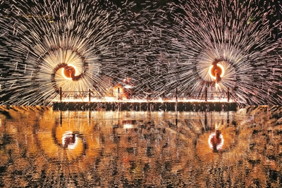 ② 2月13日,民间艺人在江苏省句容市宝华山国家森林公园表演打铁花。新华社发 钟学满摄