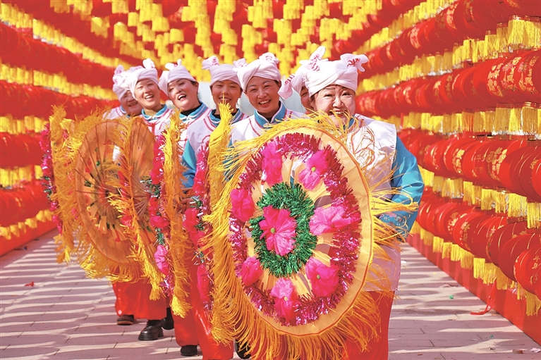 ③ 2月13日,在河南省安阳市内黄县文化体育中心,参加文艺演出的演员在排练。新华社发 刘肖坤摄