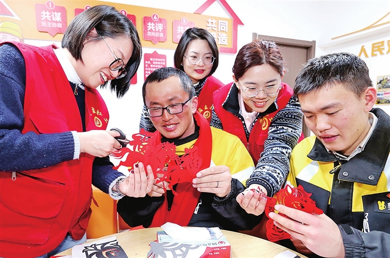 ④ 2月13日,新就业群体人员与爱心志愿者一起在山东省青岛市即墨古城暖“新”驿站剪纸。新华社发 梁孝鹏摄