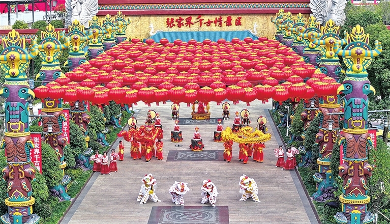 ⑤ 2月13日,湖南省张家界市武陵源区千古情景区艺术团的演员在排练迎新年节目(无人机照片)。新华社发 吴勇兵摄