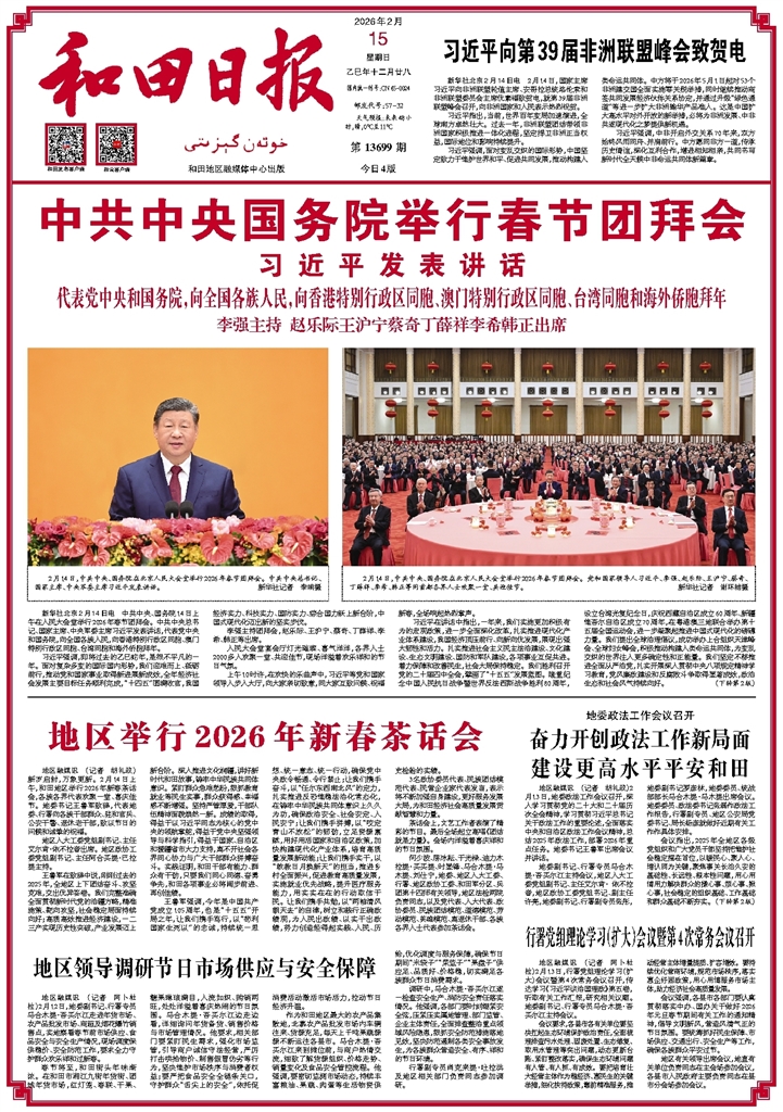 - 地区举行2026年新春茶话会 地区融媒讯 (记者 胡礼政)新岁启封,万象更新。2月14日上午,和田地区举行2026年新春茶话会,各族各界代表欢聚一堂、喜庆佳节。地委书记王鲁军致辞,代表地委、行署向各族干部群众、驻和官兵、公