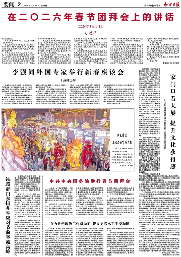 - 在二〇二六年春节团拜会上的讲话 同志们,朋友们: 丙午马年春节即将到来。今天,我们欢聚一堂,辞旧迎新。 首先,我代表党中央和国务院,向大家致以节日的美好祝福!向全国各族人民和香港特别行政区同胞、澳门特别行政区同胞、台湾同