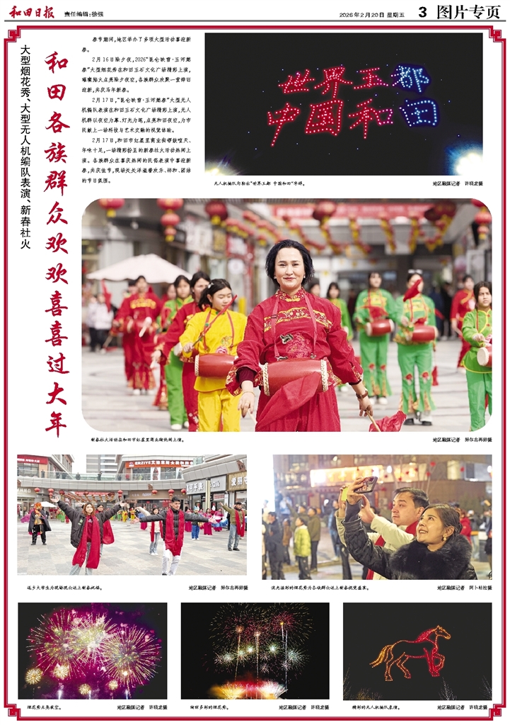 春节期间,地区举办了多项大型活动喜迎新春。 2月16日除夕夜,2026“昆仑映雪·玉河燃春”大型烟花秀在和田玉石文化广场精彩上演,璀璨焰火点亮除夕夜空,各族群众欢聚一堂辞旧迎新,共庆马年新春。