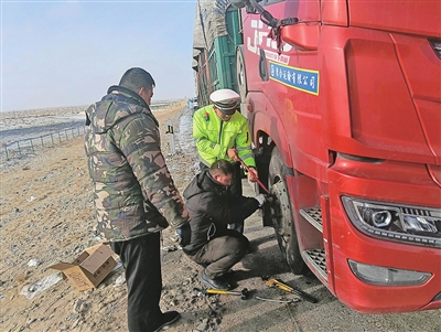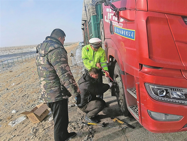 春节值守期间,大队民辅警在巡逻时发现一辆大货车因轮胎故障停在应急车道,驾驶员焦急万分。执勤人员立即做好安全警示,安抚驾驶员情绪,并迅速拿出工具帮忙更换轮胎。