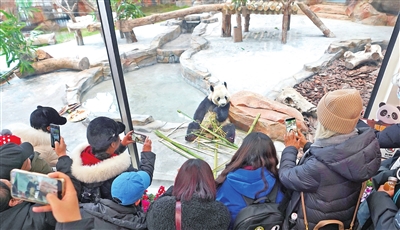 2月20日,在乌鲁木齐市水上乐园动物园(大熊猫馆)内,游客为大熊猫“宝元”拍照。