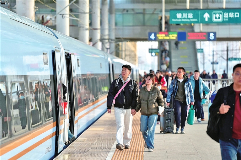 2月23日,旅客在银川火车站准备乘车。 记者从中国国家铁路集团有限公司获悉,2月23日正月初七是春节假期最后一天,全国铁路迎来返程客流最高峰,预计发送旅客1850万人次,计划加开旅客列车2297列。新华社记者 杨植森摄