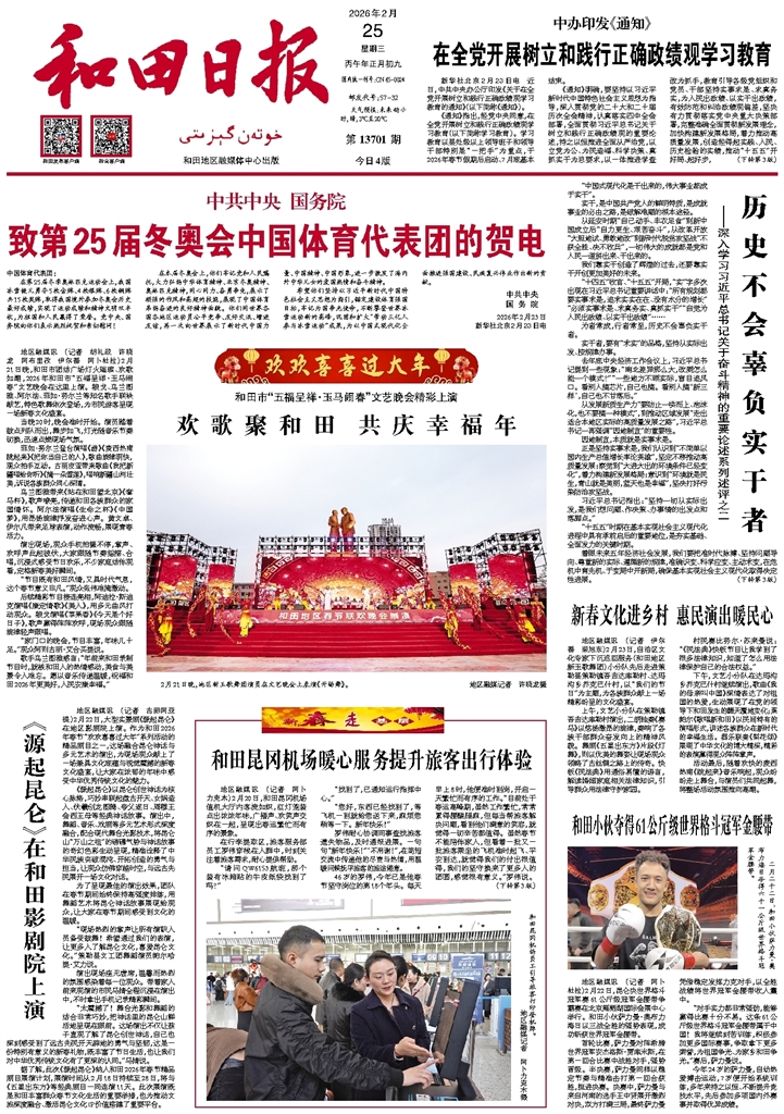- 《源起昆仑》在和田影剧院上演 地区融媒讯 (记者 古丽阿亚提)2月22日,大型实景剧《源起昆仑》在地区影剧院上演。作为和田2026年春节“欢欢喜喜过大年”系列活动的精品剧目之一,这场融合昆仑神话与多元艺术的演出,为现场观众