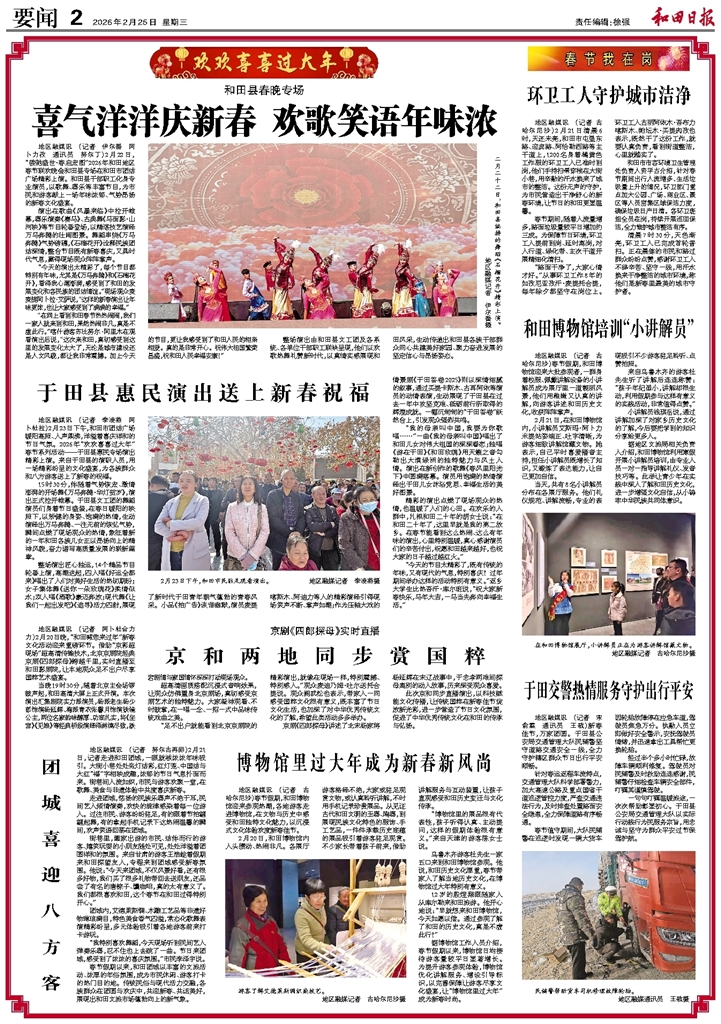 - 于田县惠民演出送上新春祝福 地区融媒讯 (记者 李凌燕 阿卜杜拉)2月23日下午,和田市团结广场暖阳高照、人声鼎沸,洋溢着喜庆祥和的节日气氛。2026年“欢欢喜喜过大年”春节系列活动——于田县惠民专场演出精彩上演。来自