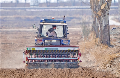 2月24日,在宁夏银川市贺兰县金贵镇银河村,农民驾驶自动播种机播种小麦。
