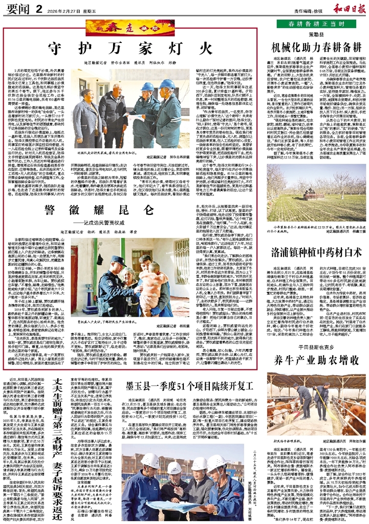 - 守护万家灯火 2月的塔克拉玛干沙漠,冷风裹着细沙掠过沙丘。达里雅布依新村的村民们还在过年时,35千伏斯达线巡线员陆泽文已背上工具包,和同事踏上沙漠腹地的巡线路。这是他扎根沙漠坚守的第五个春节。眼下,他正参与35