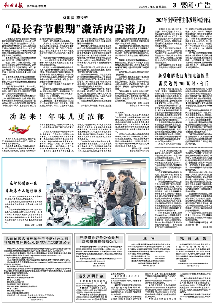 - 2025年全国经营主体发展向新向优 新华社北京2月26日电 (记者 王悦阳)记者2月26日从市场监管总局获悉,2025年全国新设经营主体2574.5万户。其中,新设企业950万户,新设个体工商户1619.4万户。经营主体呈现向新