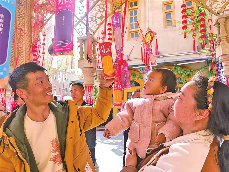 活动现场设诗词拓印工坊,游客在工作人员指导下,手持拓包在铺有宣纸的诗碑上按压完成拓印作品。文创摊位摆放马年主题明信片和书签。亲子互动区设“书香寻宝”环节,游客艾合买提江从图书展台抽取书籍并朗读指定段落后获“福马券”。