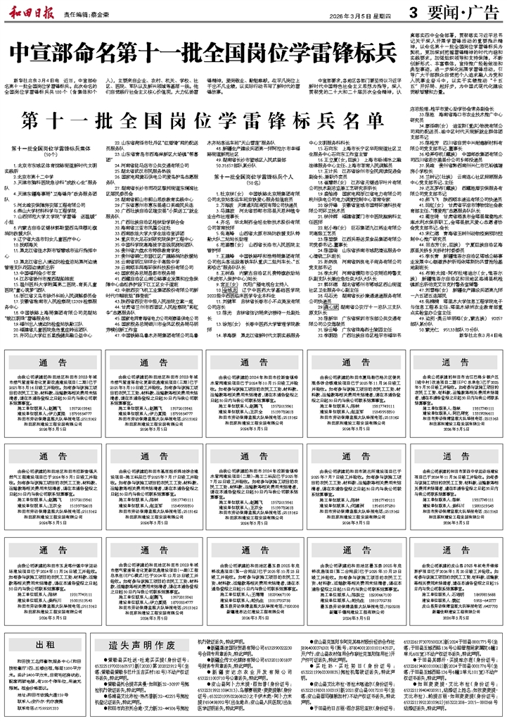 - 中宣部命名第十一批全国岗位学雷锋标兵 新华社北京3月4日电 近日,中宣部命名第十一批全国岗位学雷锋标兵。此次命名的全国岗位学雷锋标兵共100个(含集体和个人),主要来自企业、农村、机关、学校、社区、医院、军队以及新兴领域等基层一线。