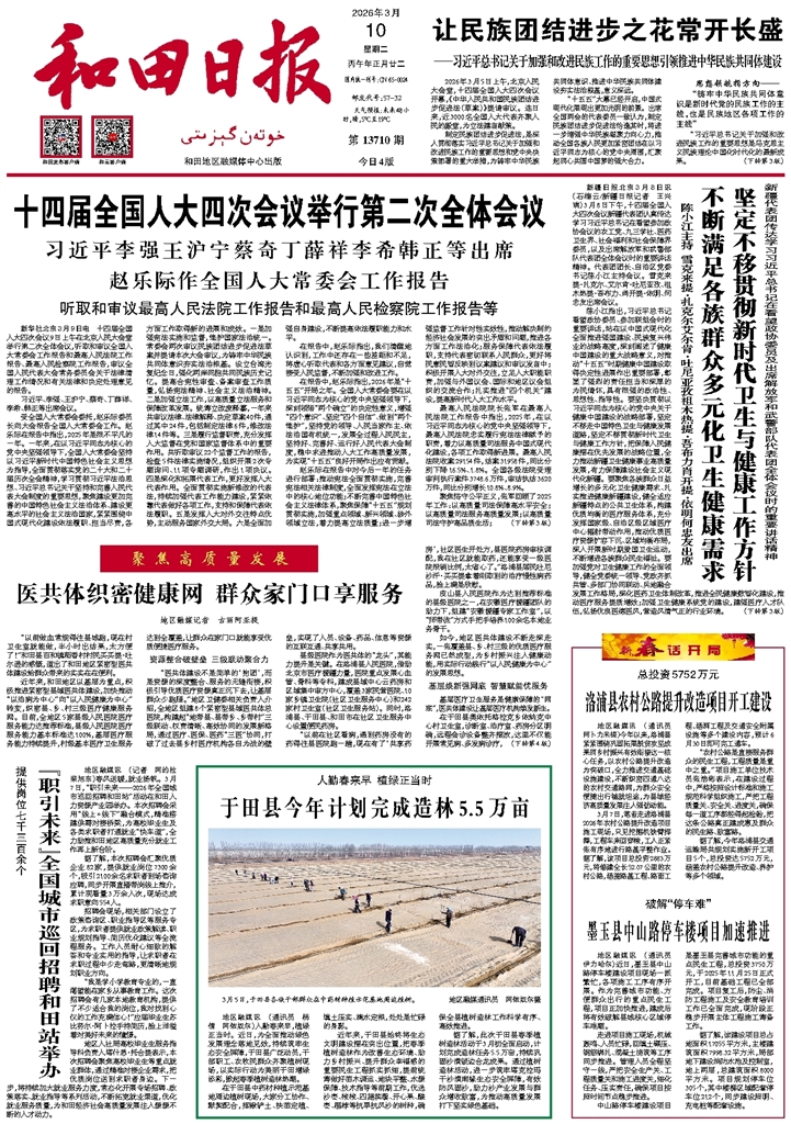 地区融媒讯 (通讯员 杨倩 阿依奴尔)人勤春来早,植绿正当时。近日,为全面推动绿色发展理念落地见效,持续筑牢生态安全屏障,于田县广泛动员,干部职工、农牧民群众齐聚植树现场,以实际行动为美丽于田增绿添彩,掀起春季植树造林热潮。