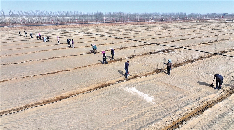 在于田县中药材种植示范基地周边植树现场,大家分工协作、默契配合,挥锹铲土、扶苗定植、填土压实、滴水定根,处处是忙碌的身影。