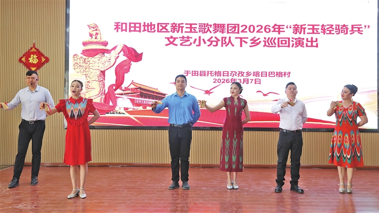 地区融媒讯 (通讯员 伊帕尔古丽 姆克热木)3月7日,地区新玉歌舞团“新玉轻骑兵”文艺小分队走进于田县各乡镇村,开展为期6天的惠民文艺演出,献上12场精彩纷呈的文艺盛宴,将党和政府的深切关怀,送到基层群众的心坎上。