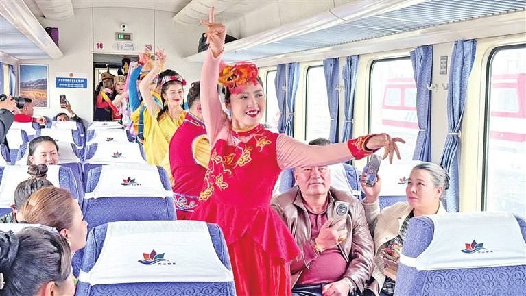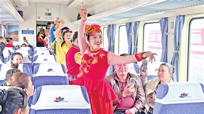 活动现场,伴随着欢快的旋律,演员身着绚丽的服饰,为大家献上《和田是个好地方》等精彩歌舞。优美的舞姿与动人的歌声瞬间点燃了现场氛围,掌声与喝彩声此起彼伏,不少旅客还跟着节奏轻声哼唱,原本漫长的旅途充满了欢声笑语。