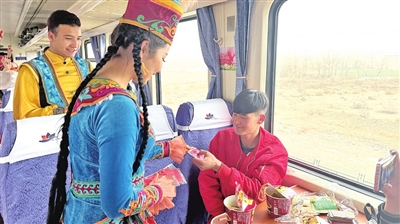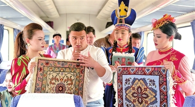 和田好物展示环节同样人气十足。和田羊毛地毯、艾德莱斯绸等文创精品琳琅满目,玫瑰花茶、酸奶粽子、玫瑰花酱、特色月饼等农特产品香气扑鼻。旅客纷纷品尝、咨询购买,许多人现场下单,让和田好物“跟着火车走四方”。