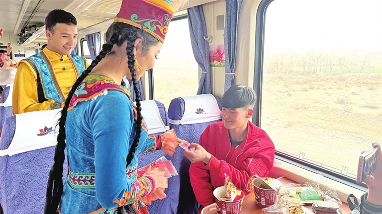 5818次列车全程1764公里,运行22小时31分钟,途经洛浦、于田、策勒、民丰、且末、库尔勒等站点,是沿线群众出行的“便民公交”,也是联通南北疆的“连心车”。活动结合多种形式,让慢火车不仅是“出行车”,更成为文化传播、助农增收、凝聚人心的“移动平台”。