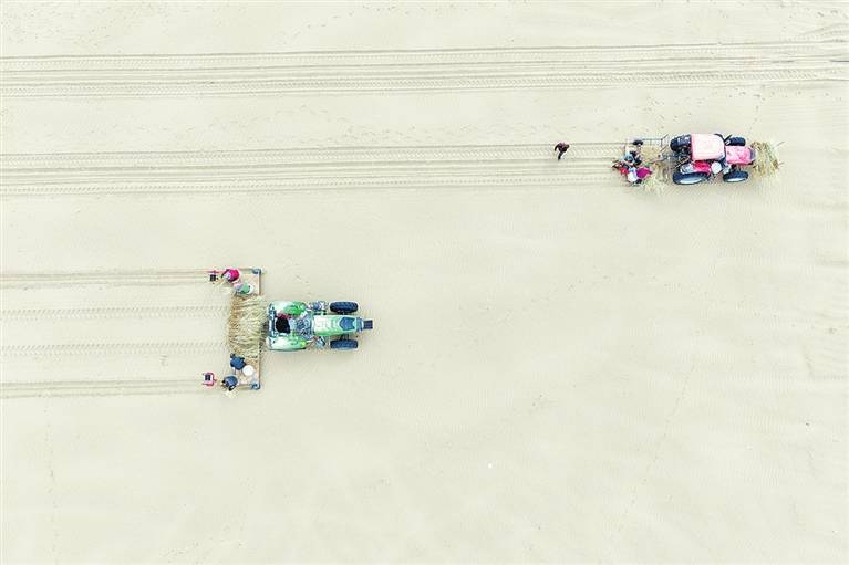 据了解,此次投入使用的双轨式植树机,每台配备2名村民协同操作,单日可完成树苗种植1.3万棵。该设备针对戈壁沙漠土壤特点进行了专项优化,借助北斗导航系统实现行驶速度稳定、种植位置精准,树苗株距均匀、挖坑深度统一,便于滴灌带精准供水,有效提升了树苗存活率。