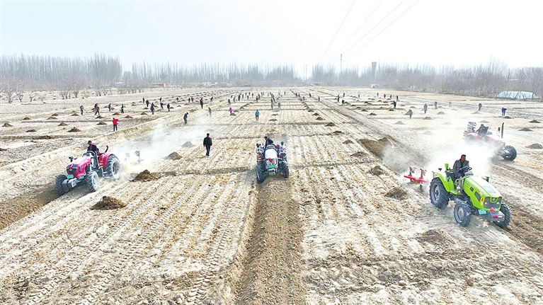 地区融媒讯 (记者 胡礼政 阿卜力克木)3月19日,在和田县群众防沙治沙点,北斗导航无人驾驶拖拉机牵引着双轨式植树机匀速作业,挖坑、栽苗、铺滴灌带、覆土、压实等工序连贯完成,单棵树苗从挖坑到栽种仅需5秒,作业效率较传统人工模式提升十倍以上,开启了当地防沙治沙的“加速度”。