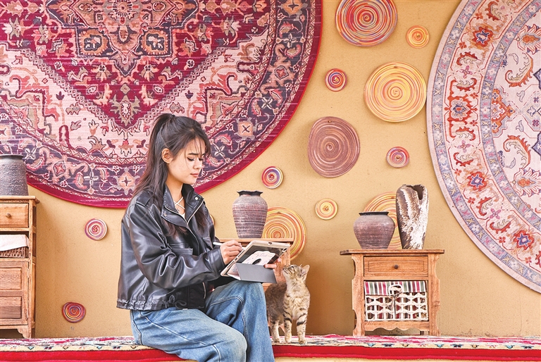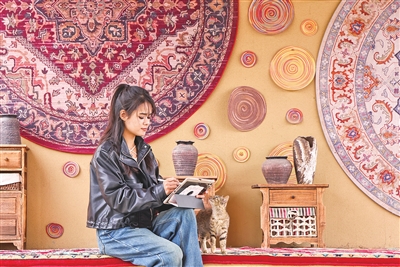 2021年,怀揣着心中梦想和家乡羁绊,穆耶赛尔考入新疆艺术学院,奔向艺术之旅。2023年,穆耶赛尔尝试在小红书上发布设计作品,并借助淘宝、抖音等平台接设计订单。“第一单是LOGO设计,我花了一整天时间,挣了100元,激动得一夜没睡。”穆耶赛尔的话语中透着成就感。