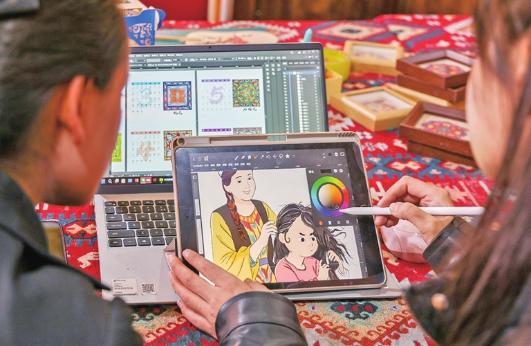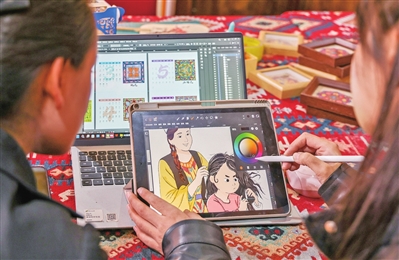 3月18日,在墨玉县桑皮纸产业园文创工作室,“00后”设计师穆耶赛尔·艾合麦提托合提正一边在画图软件上翻看先前的设计图稿,一边寻找桑皮纸文创新灵感。