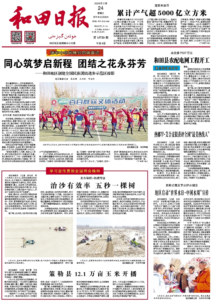 - 同心筑梦启新程 团结之花永芬芳 昆仑叠翠映初心,玉河含情润和田。 昆仑山下,在和田团城景区观赏民族特色歌舞、传统建筑、非遗技艺展示,民族团结进步呈现新气象;玉龙河畔,和田地区“村BA·乡村篮球联赛与村超·乡村足球联赛”激情开