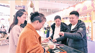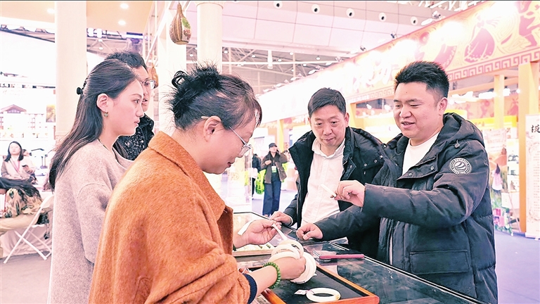 和田地区“世界玉都·中国和田”文旅主题展馆集中呈现13家文旅企业带来的81种文旅产品,涵盖雕琢精美的和田玉、极具特色的“五星出东方利中国”文创产品、色彩斑斓的艾德莱斯绸、巧夺天工的根雕,以及和田药茶等,以丰富的品类全方位彰显和田多元魅力,吸引了众多游客驻足参观打卡。
