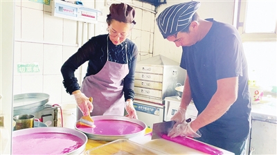 学成回村后,两人没有守着老做法一成不变。看着大家越来越注重吃得健康、吃得新鲜,他们琢磨着给凉皮做点新花样。没有添加任何人工色素,就用家里常见的胡萝卜、菠菜,还有香甜的火龙果,洗净榨汁后揉进面里,橙、绿、红三色的果蔬凉皮就此诞生。